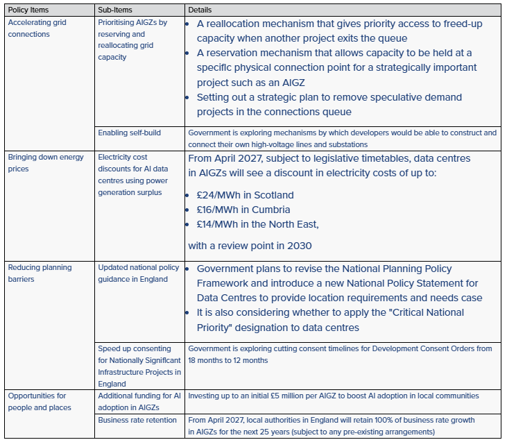 We explore the proposed policy changes below, giving an overview of the key elements, application requirements, and current status of AIGZs, and considering their implications for AI data centre investment in the UK.