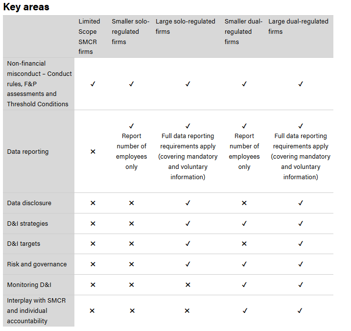 The regulators proposals apply differently to firms depending on their number of employees, their categorisation under the Senior Managers and Certification Regime (SM&CR), and whether they are dual-regulated. To reduce regulatory burden, smaller firms with fewer than 251 employees would be exempt from many of the requirements.