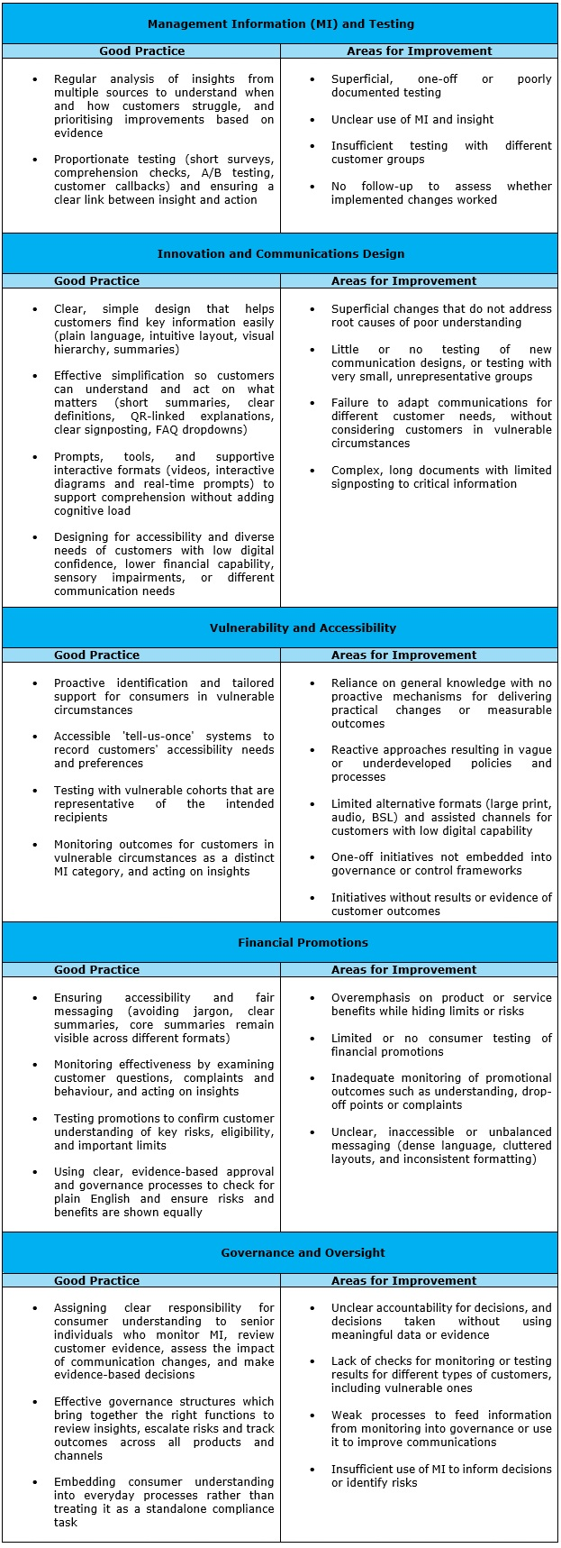 The report emphasises that to support consumer understanding, firms should ensure that their communication design, testing, monitoring, and governance form a coherent, end-to-end process.